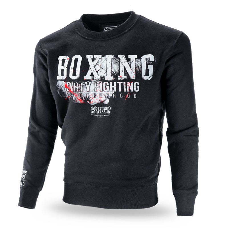 100% pamučna dukserica preko glave. Donji dio dukserice i rukavi završeni su širokim elastičnim obrubom. Na lijevom rukavu ušivena je mala ceduljica s logotipom branda Doberman's Aggressive.Na desnom rukavu iznad zapešća je tisk s logom brenda i natpisom BOXING DIRTY FIGHTING.Prednja strana je ukrašena velikim tiskom BOXING DIRTY FIGHTING s logotipom robne marke i šakama. Na poleđini je smanjeni motiv BOXING logotipom robne marke.