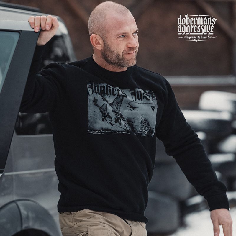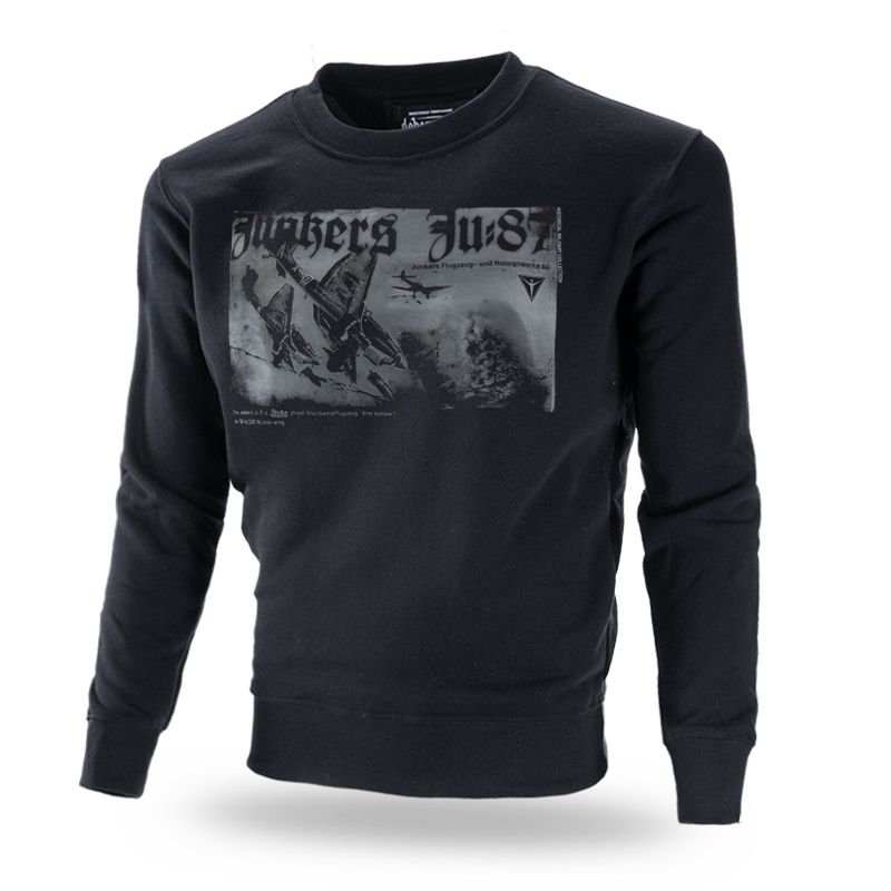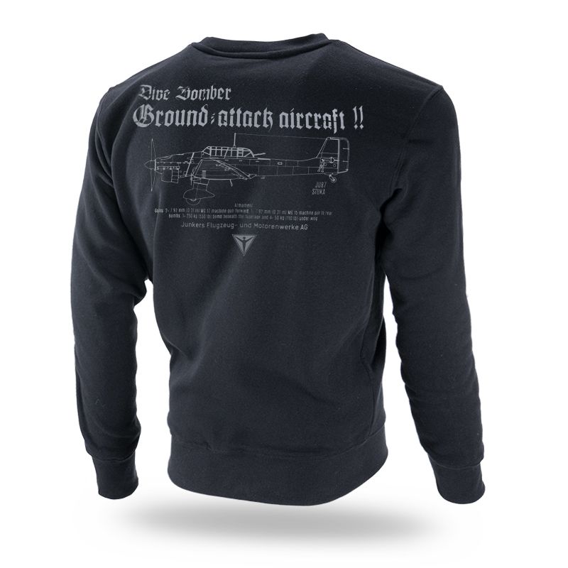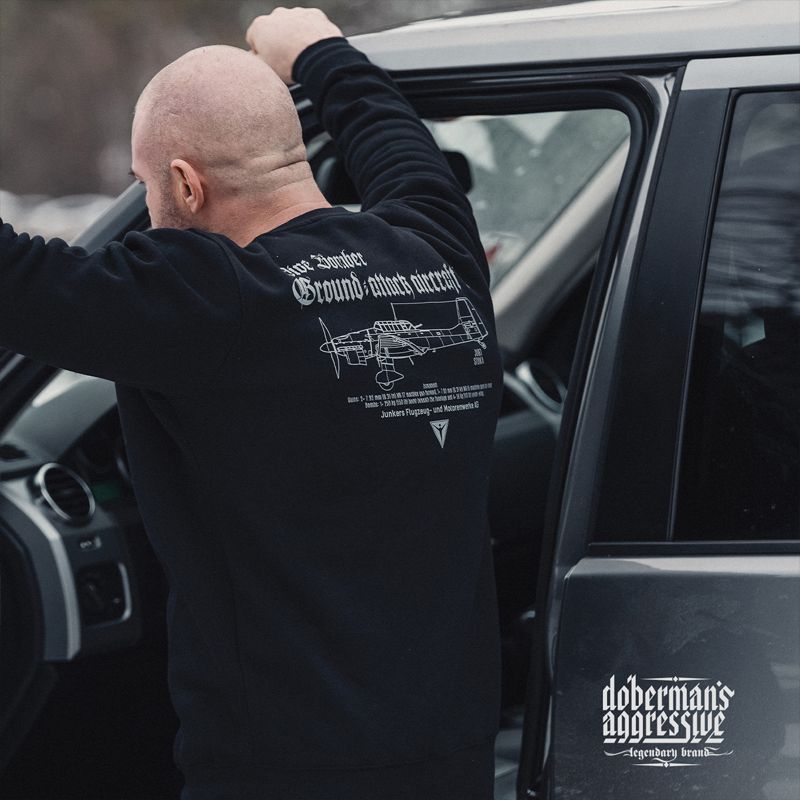 Klasična muška dukserica preko glave. Na lijevom rukavu mala je aplikacija logotipa Doberman’s Aggressive. Otisak na prednjoj strani prikazuje bombardere Ju87 iz Drugog svjetskog rata. Na zadnjoj strani je crtež zrakoplova s opisom naoružanja.