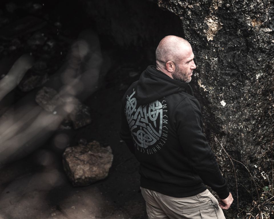 Klasična muška dukserica preko glave. Na lijevom rukavu mala je aplikacija logotipa Doberman’s Aggressive.Na prednjoj strani nalazi se mali izvezeni zakrp s nordijskim simbolom. Poleđina je ukrašena velikom grafikom u nordijskom stilu izrađenom metodom konveksnog tiska.