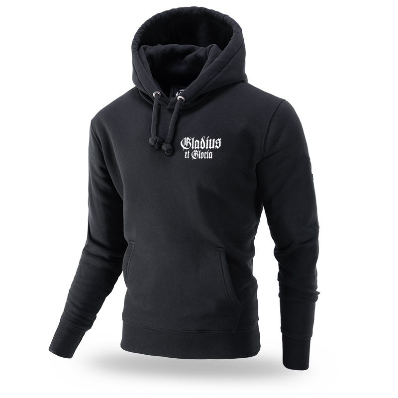 Dukserica s kapuljačom Dobermans Aggressive izrađena je od ugodnog pamuka, završena širokim, elastičnim rubom na rukavima i struku. Kao što je tipično za Doberman's Aggressive brend pozadi je veliki tisk Spartan Gladius of Gloria. Na prednjoj levoj strani na grudima je manji Gladius of Gloria natpis.