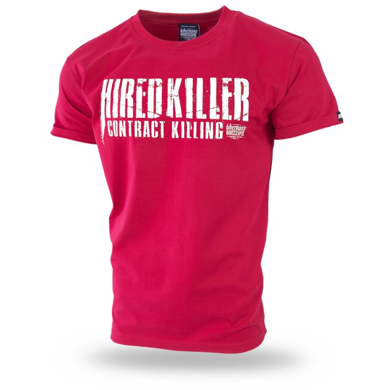 Muška majica kratkih rukava i klasičnog kroja. Na lijevom rukavu mala je aplikacija logotipa Doberman’s Aggressive. Na prsima otisak Hired Killer. Na stražnjoj strani vrata CALL ME [+ 383] 943 32 88.