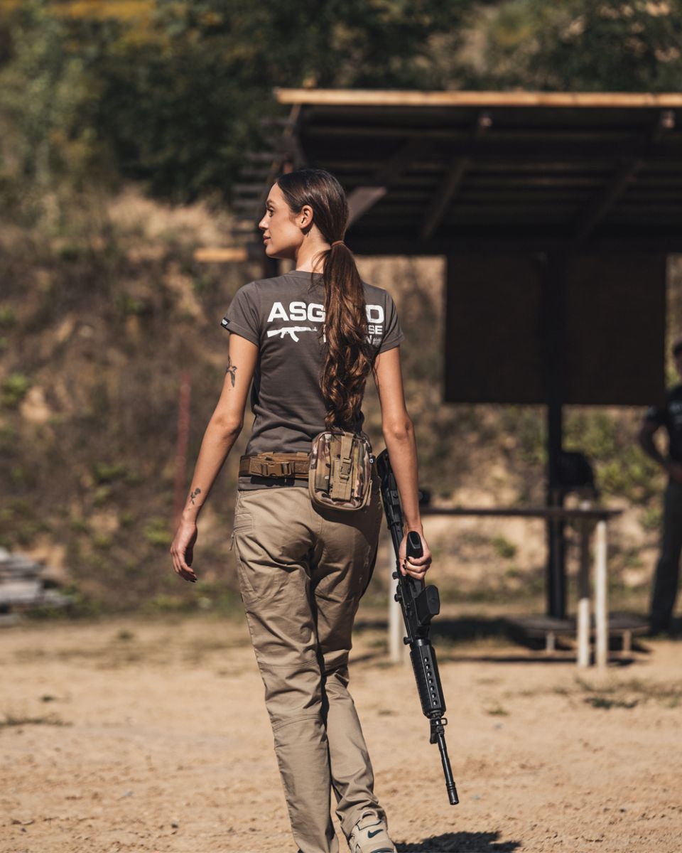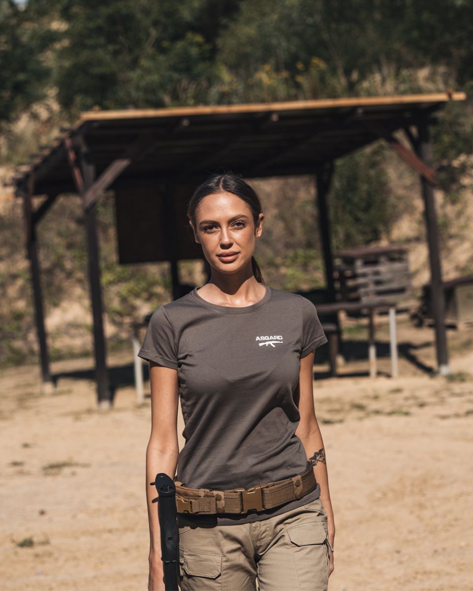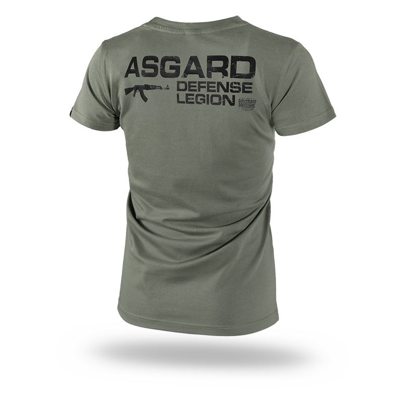Ženska majica, blago strukirana. Na lijevom rukavu mala je aplikacija logotipa Doberman’s Aggressive. Na poleđini se nalazi 3D otisak „Asgard Defense Legion”.