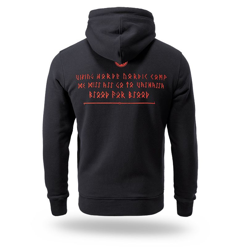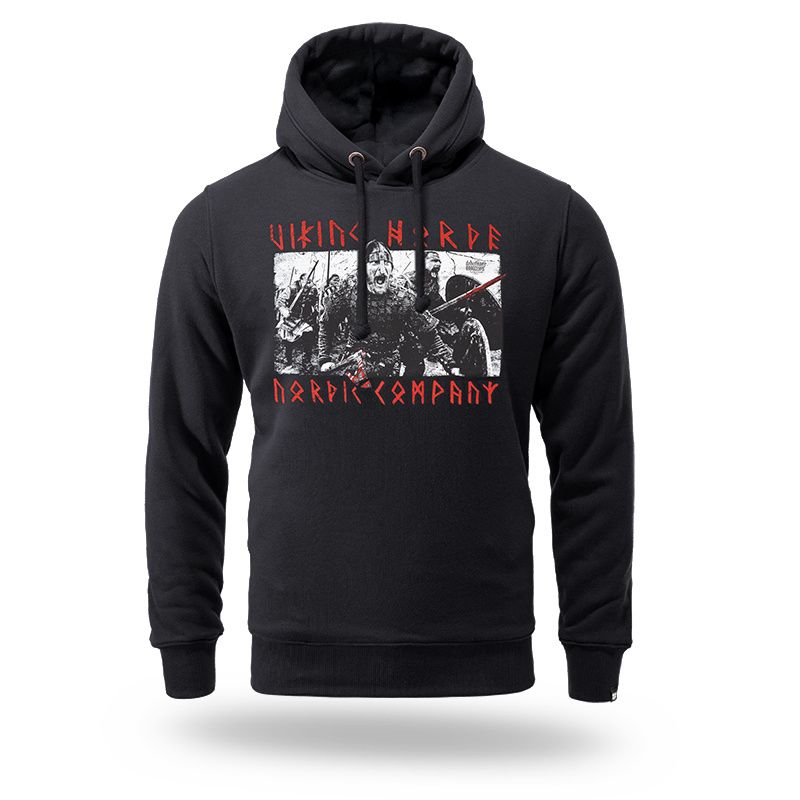 Dukserica s kapuljačom Dobermans Aggressive izrađena je od ugodnog pamuka, završena širokim, elastičnim rubom na rukavima i struku. Na lijevom rukavu nalazi se mala oznaka s logom Doberman's Aggressive. Na prednjoj strani se nalazi tisak koji prikazuje Vikinge u napadu sa sloganom VIKING HORDE. Dok se na poleđini nalazi tekst s runskim simbolima.