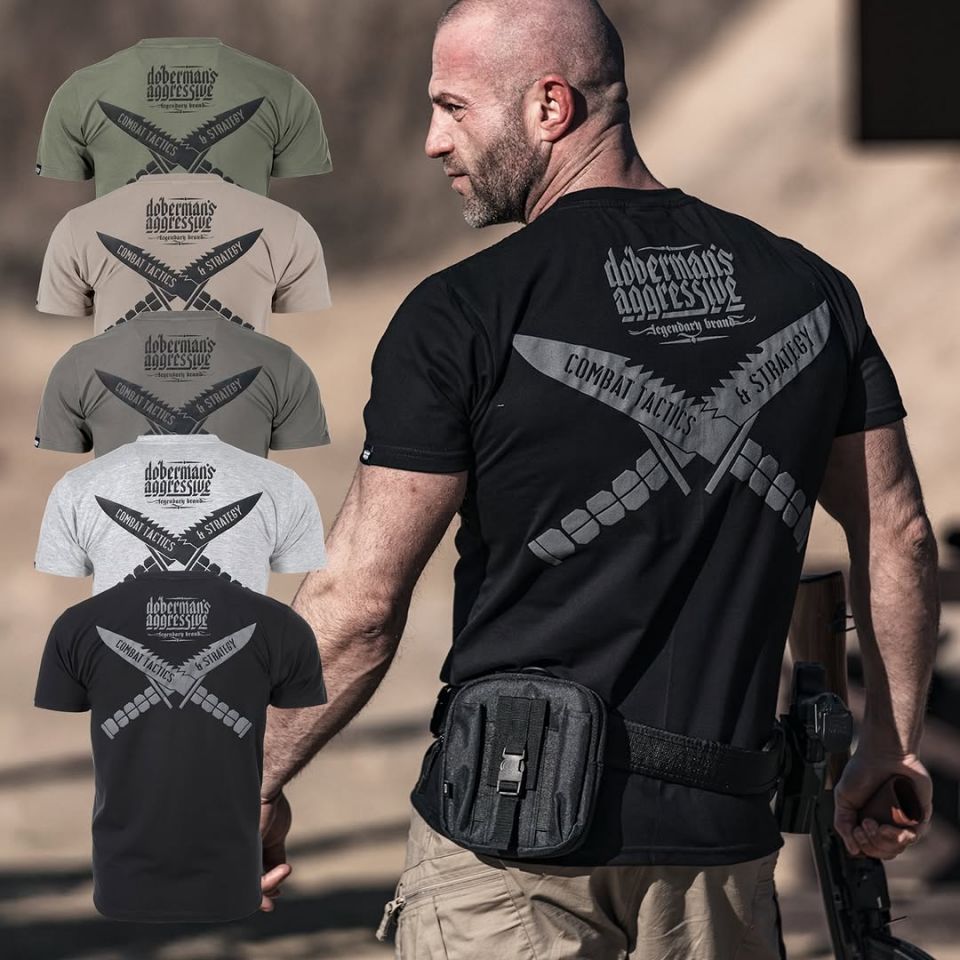 Muška majica kratkih rukava i klasičnog kroja. Na lijevom rukavu mala je aplikacija logotipa Doberman’s Aggressive Na leđima veliki 3D puffy print koji prikazuje ukrižene taktičke noževe s oštricama usmjerenim prema gore i natpis "COMBAT TACTICS & STRATEGY". Prednja strana je bez printa.