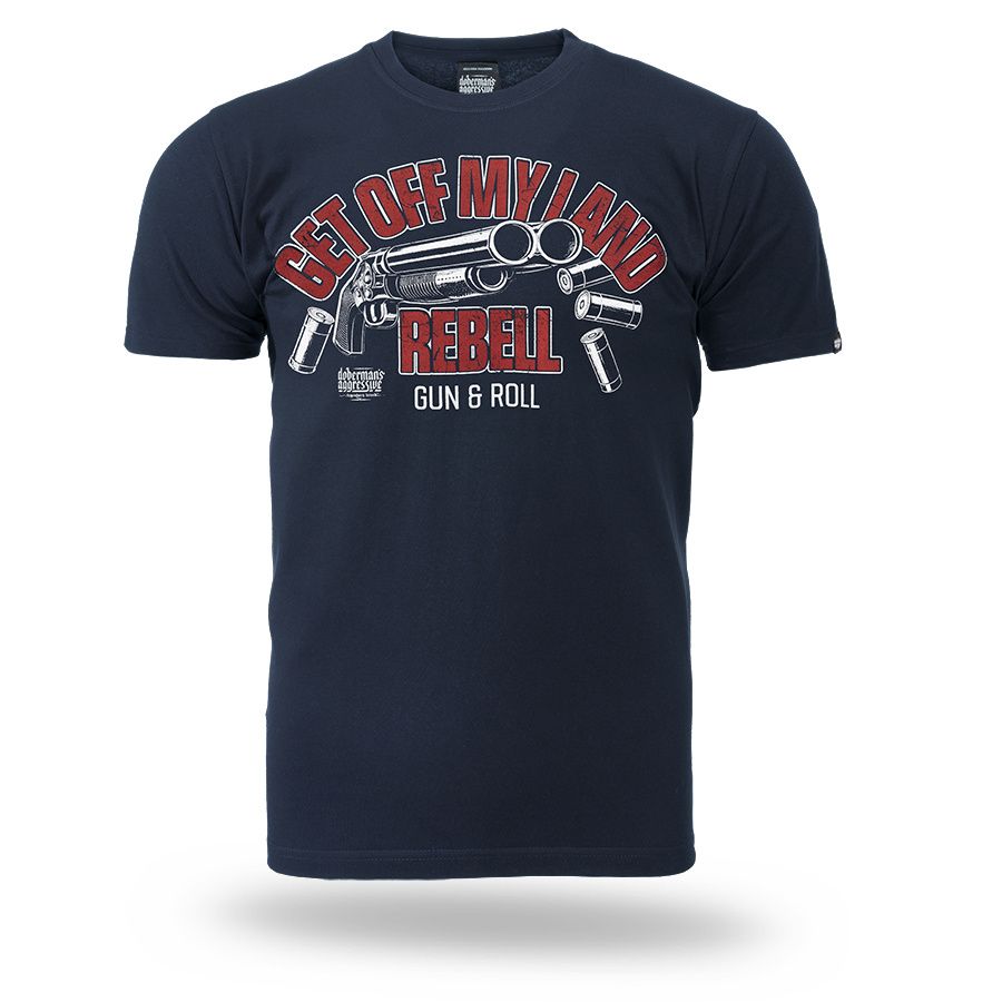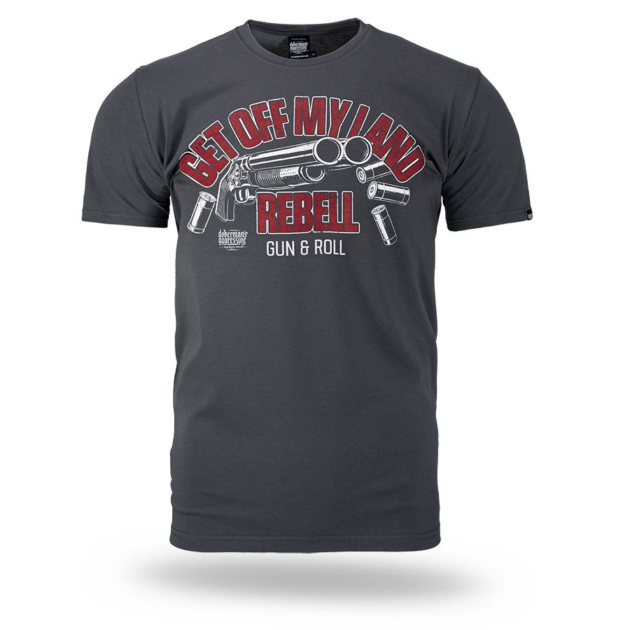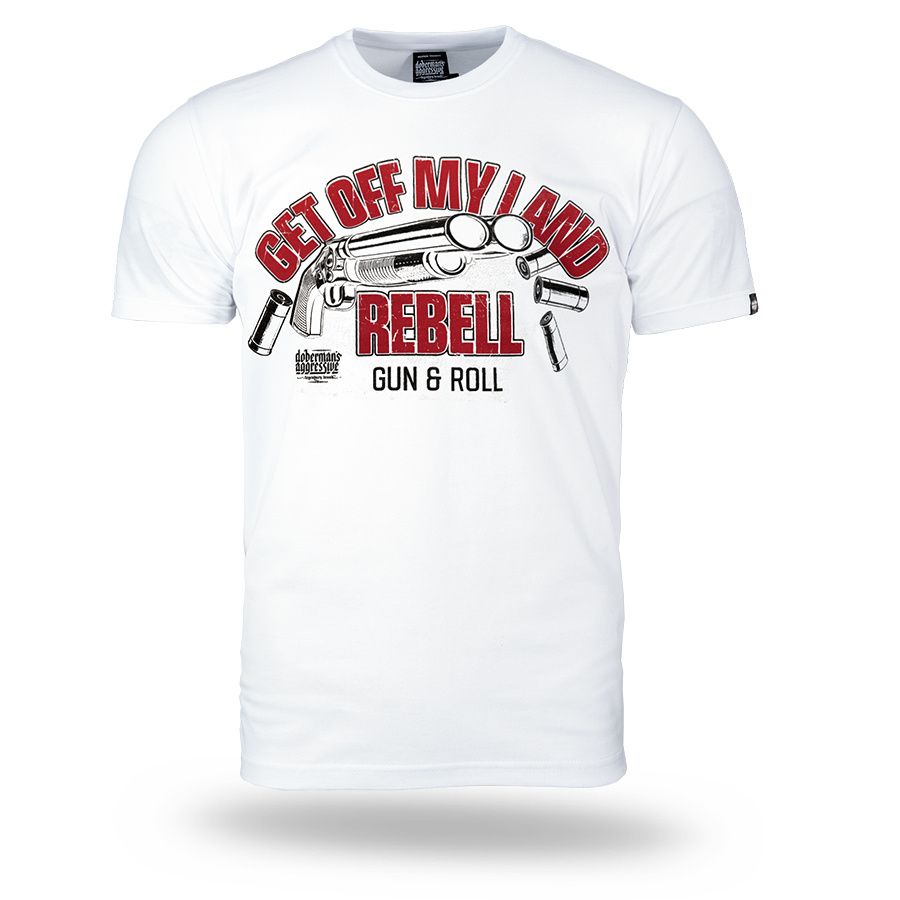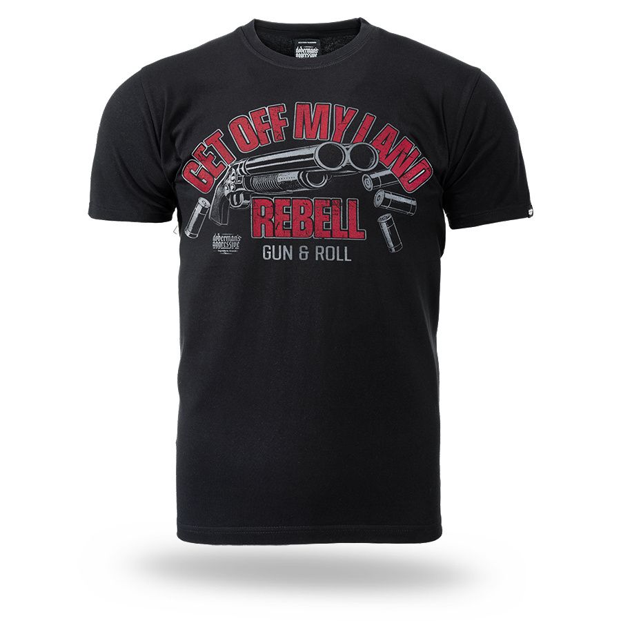 Muška majica kratkih rukava i klasičnog kroja. Na lijevom rukavu mala je aplikacija logotipa Doberman’s Aggressive. Na prsima je veliki otisak Get Off My Land REBELL Gun & Roll.