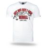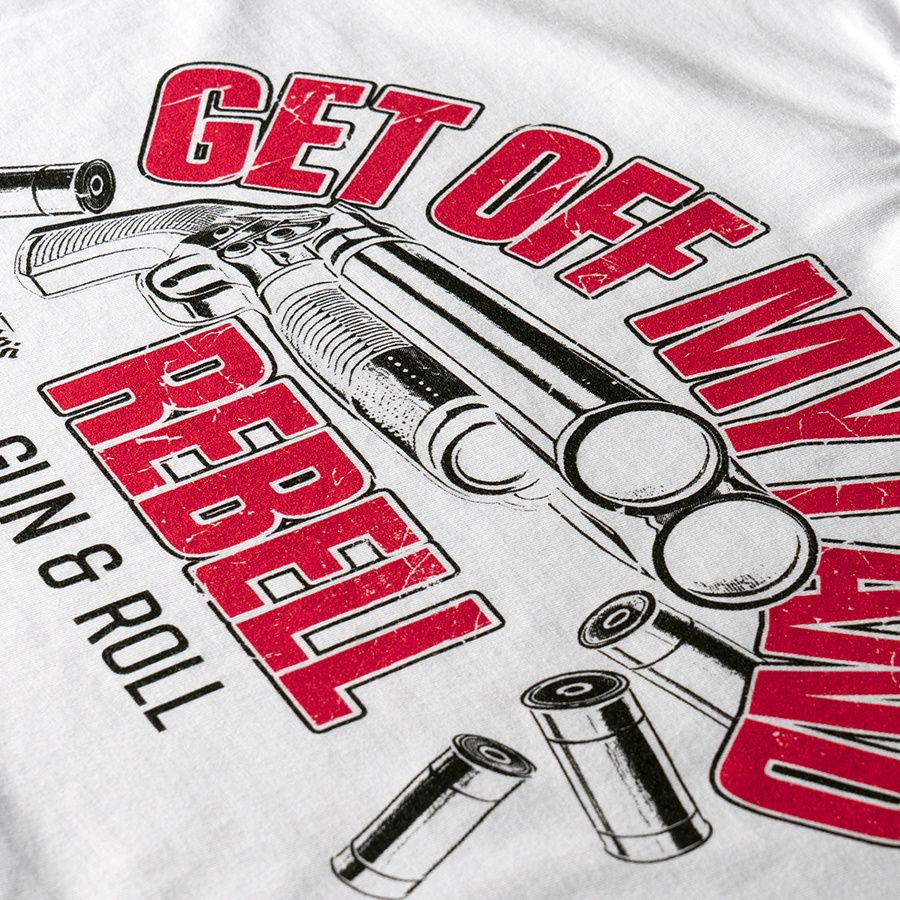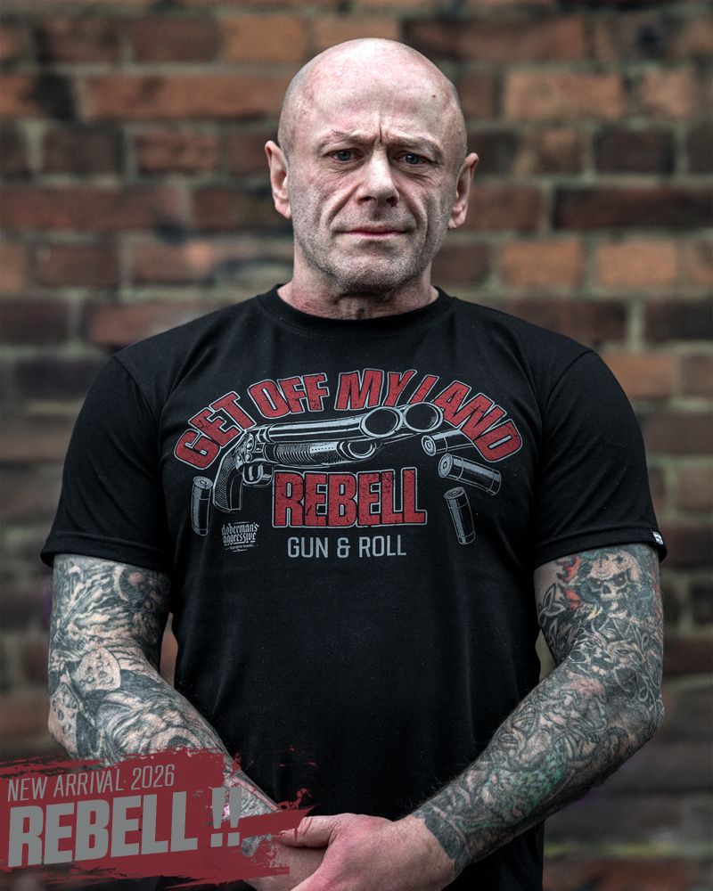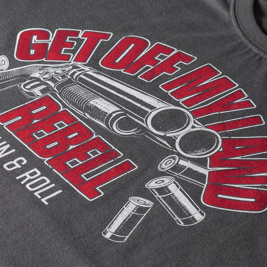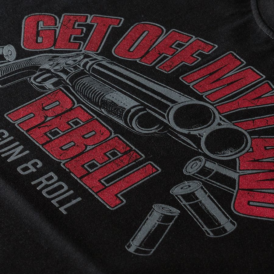 Muška majica kratkih rukava i klasičnog kroja. Na lijevom rukavu mala je aplikacija logotipa Doberman’s Aggressive. Na prsima je veliki otisak Get Off My Land REBELL Gun & Roll.