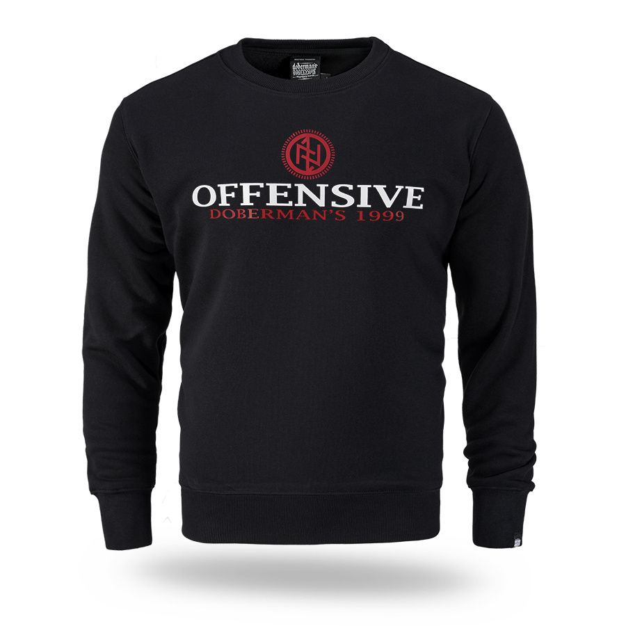 Klasična muška dukserica preko glave. Na lijevom rukavu mala je aplikacija logotipa Doberman’s Aggressive. Na prsima je veliki otisak Offensive Doberman´s 1999.