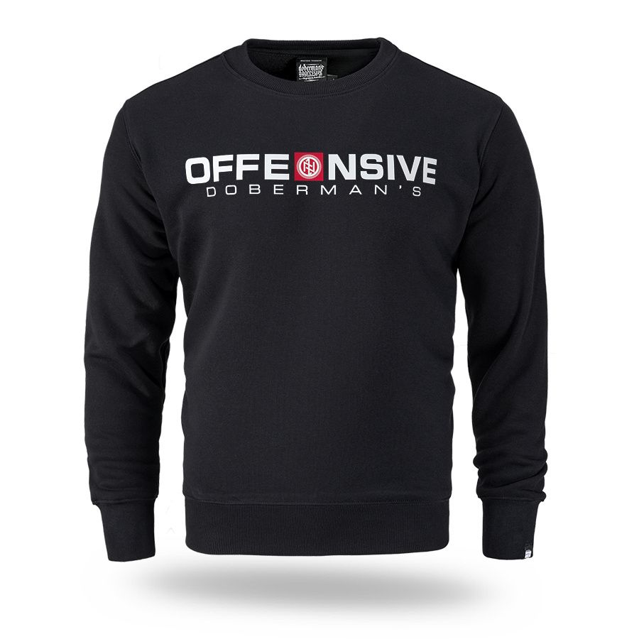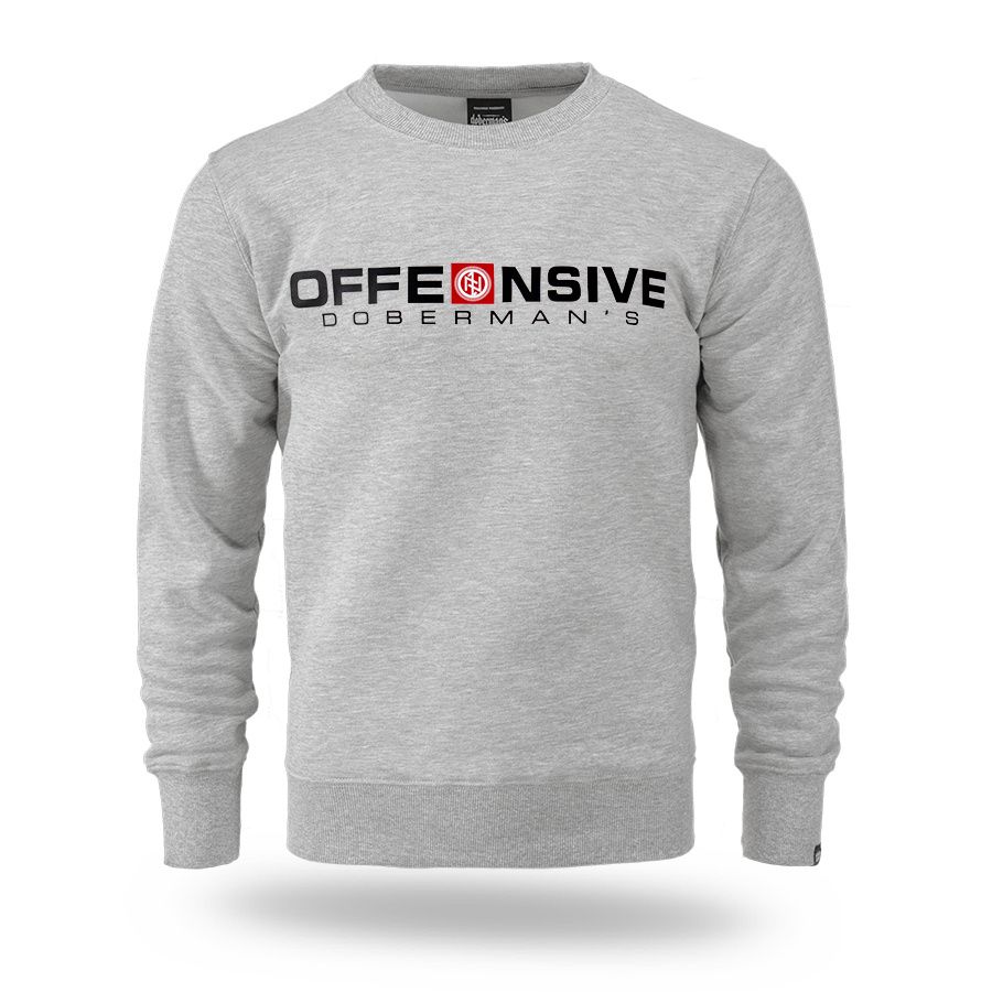 Klasična muška dukserica preko glave. Na lijevom rukavu mala je aplikacija logotipa Doberman’s Aggressive. Na prsima je veliki otisak Offensive Doberman´s.