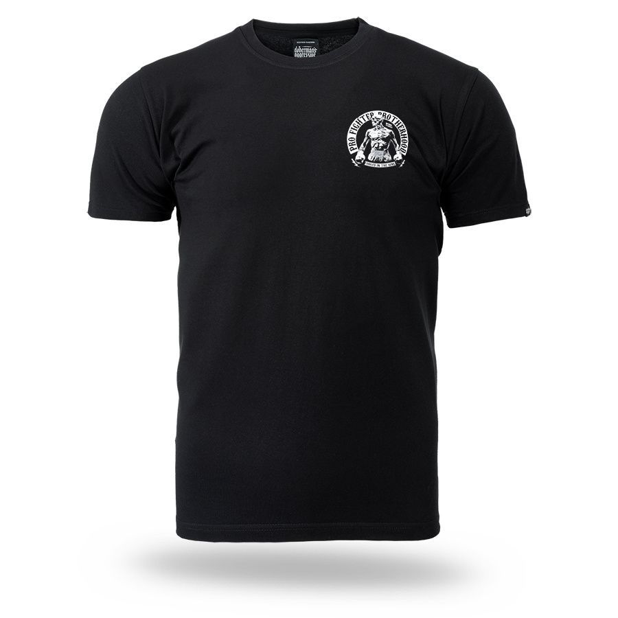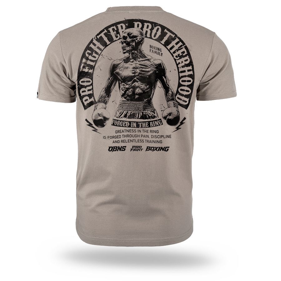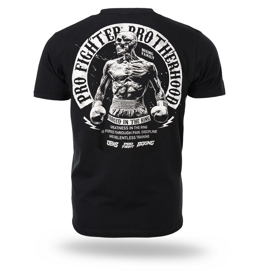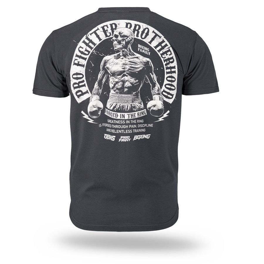 Muška majica kratkih rukava i klasičnog kroja. Na lijevom rukavu mala je aplikacija logotipa Doberman’s Aggressive. Na prednjoj i stražnjoj strani nalazi se otisak Pro Fighter Brotherhood – Forged in the Ring.